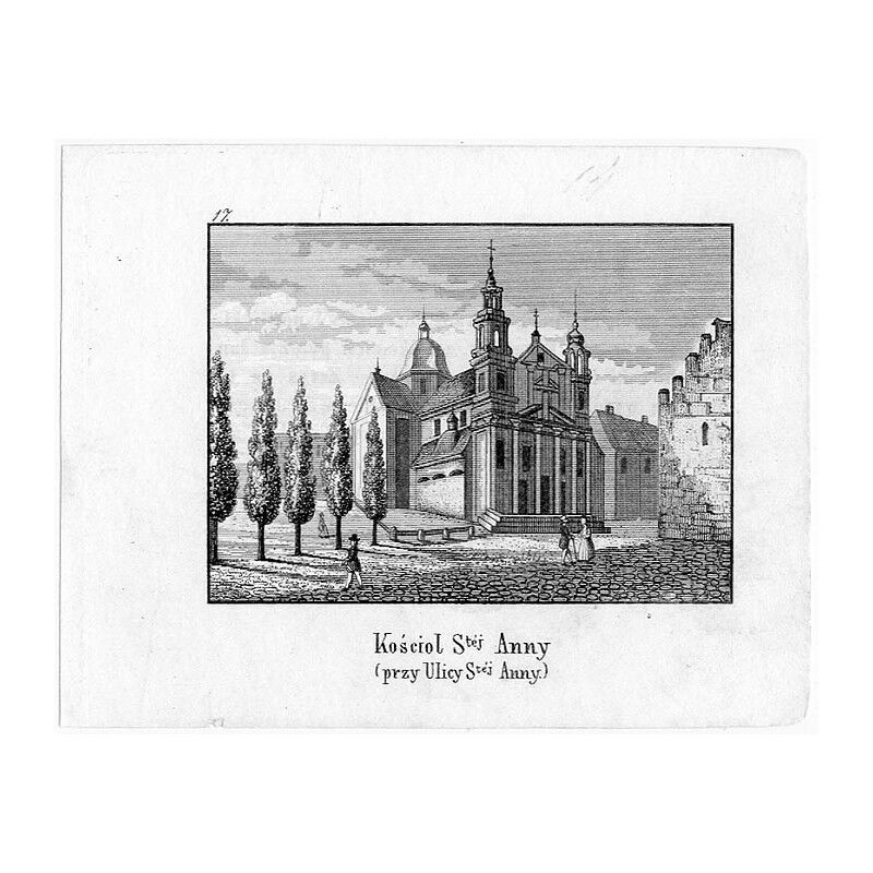 Rycina z widokiem kościoła św. Anny w Krakowie pochodzi z dzieła „Kościoły Krakowskie wydane w stalorytach z treściwym onych opisem”, Kraków 1855, druk: Józef Czech.