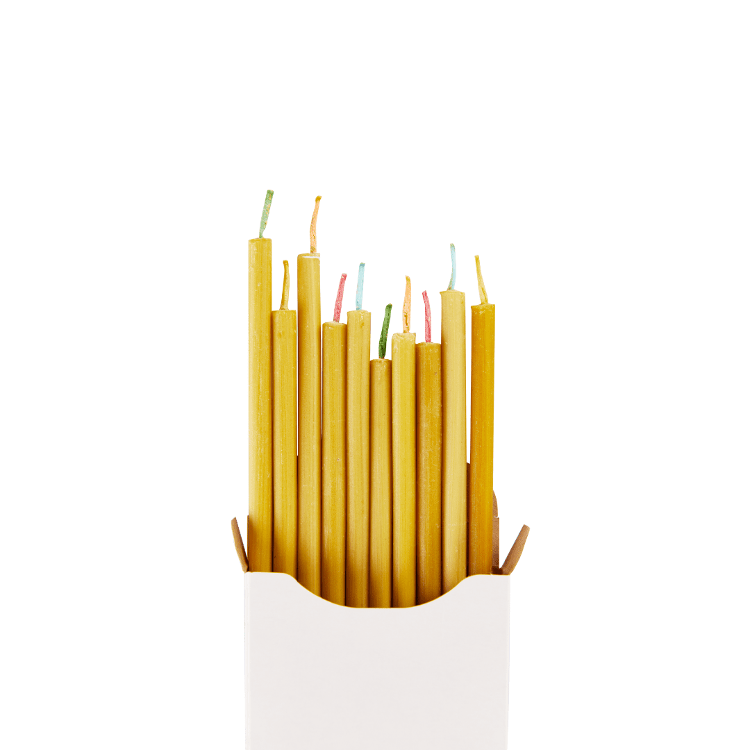 Długie świece wykonane z czystego wosku pszczelego z kolorowymi bawełnianymi knotami.